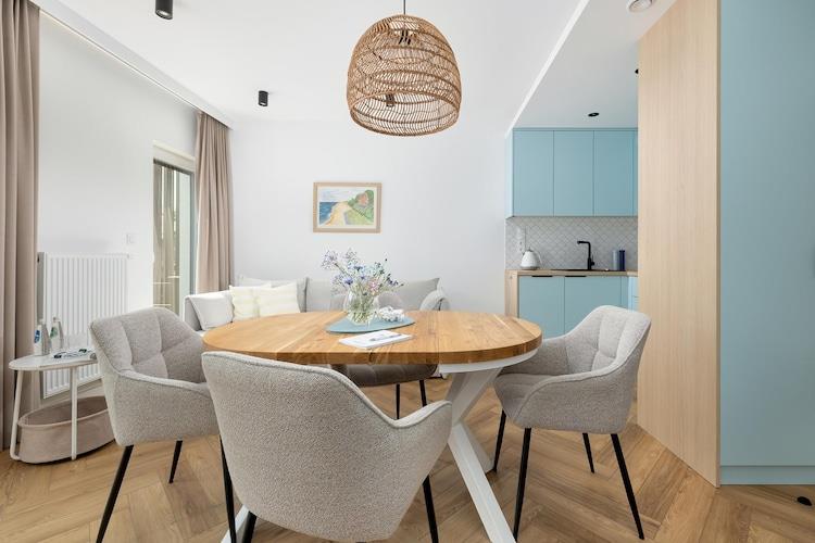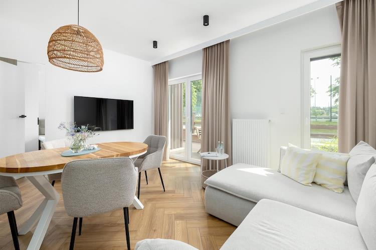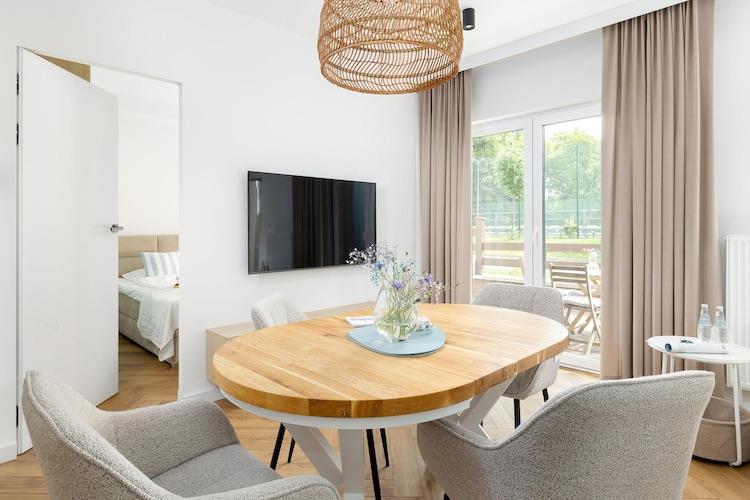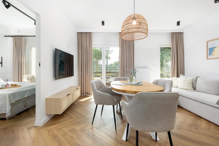 Dieses gemütliche, stilvolle Apartmentgebäude befindet sich in einem ruhigen Teil des schönen Ferienortes Trzesacz. Der Strand ist 450 Meter entfernt. Trzesacz bietet mehrere interessante Restaurants und einige Geschäfte mit einem umfassenden Sortiment. Dieses komfortable Apartment befindet sich im Erdgeschoss und verfügt über eine große, teilweise überdachte Terrasse mit Gartenmöbeln und Liegestühlen. Das Apartment besteht aus einem Wohnzimmer (mit TV, Doppelschlafsofa und Tisch mit Stühlen), einer gut ausgestatteten Küche, einem Badezimmer mit Dusche und einem Schlafzimmer mit einem bequemen Doppelbett. Eine Waschmaschine ist vorhanden. Zentralheizung und WLAN sind ebenfalls vorhanden. Das eingezäunte und gepflegte Gelände des Resorts umfasst einen großen Sommerpool (geöffnet von Mitte Juni bis Mitte September, mit beheiztem Wasser in den Sommermonaten) und einen attraktiven Spielplatz. Sichere Parkplätze stehen ebenfalls zur Verfügung. Im Preis inbegriffen sind Strom- und Wasserverbrauch, Internet und Parkplatz. Ein Kinderbett und ein Hochstuhl sind auf Anfrage erhältlich. Trzesacz ist ein kleiner, stimmungsvoller Ferienort an der Ostseeküste. Er bietet einen sauberen Strand und einen bewachten Badebereich. Die Stadt zieht Touristen an, die Fotos mit den Ruinen einer mittelalterlichen Kirche machen möchten, die auf einer Klippe am Meer emporragen. In der Nähe befindet sich eine Aussichtsplattform, die sich perfekt für spektakuläre Sonnenuntergänge eignet. In der Umgebung gibt es eine renovierte Schmalspurbahn, die reizvolle Ausflüge zu benachbarten Ferienorten ermöglicht.