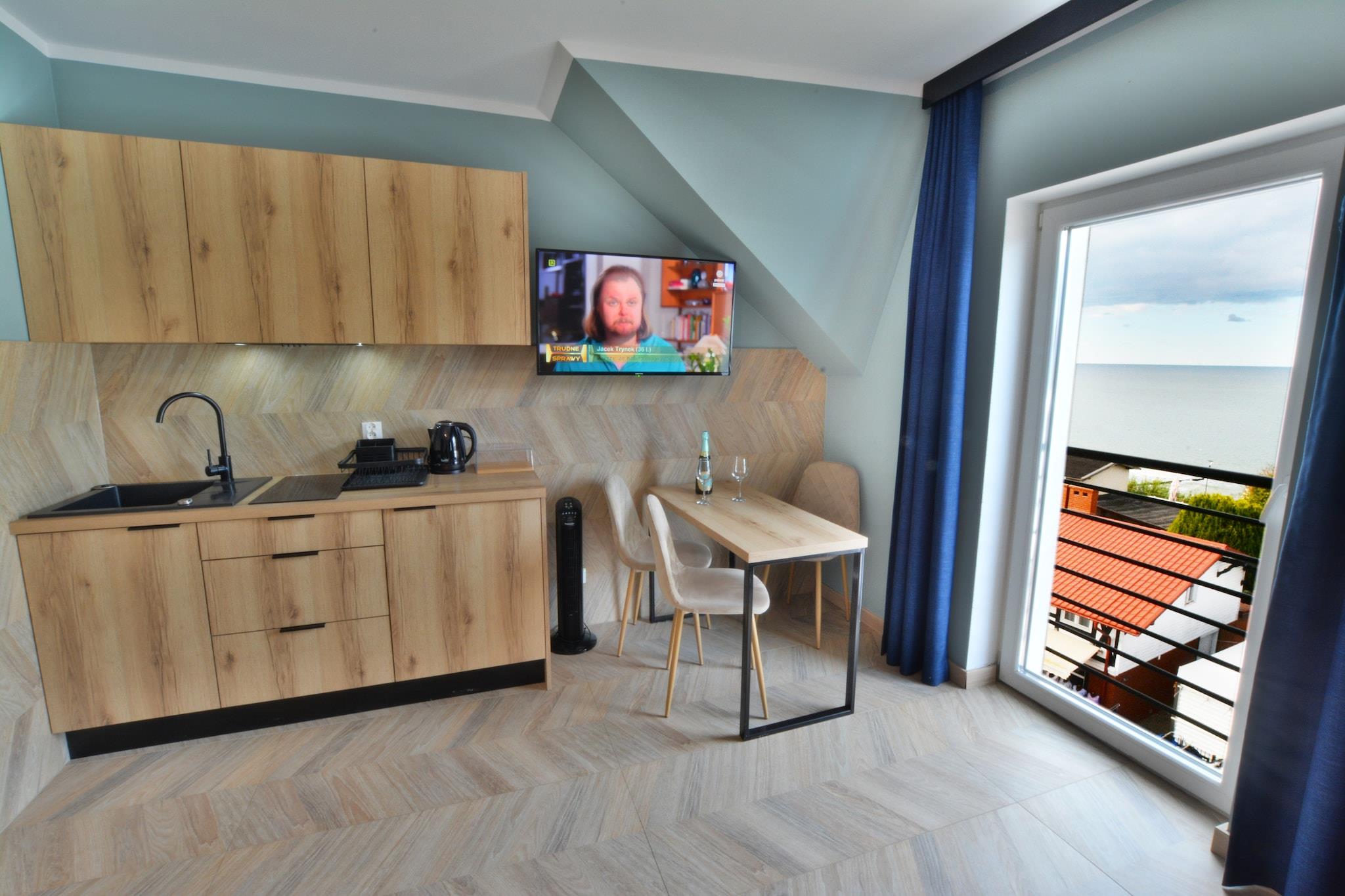Ein gemütliches Apartmenthaus im Herzen des Resorts, direkt am Strand, nur 50 Meter vom Meer entfernt. Im Erdgeschoss befindet sich eine kleine Bar. Es gibt viele andere Restaurants, Souvenirläden und Cafés in der Umgebung. Das komfortable Ferienstudio befindet sich im 3. Stock. Es bietet Platz für 3 Personen. Der unbestrittene Vorteil dieser Unterkunft ist der atemberaubende, direkte Blick auf das Meer. Die Wohnung besteht aus einem geräumigen Wohnzimmer mit einem Doppelbett, einem breiten und bequemen Sofa, einem Tisch und einem Fernseher. Es gibt auch eine Küchenzeile und ein Badezimmer mit Dusche. Zentralheizung. WLAN ist verfügbar. Es gibt kostenlose Parkplätze am Apartment. Im Preis des Aufenthalts sind enthalten: Bettwäsche, Handtücher, Wasser- und Stromverbrauch, Endreinigung, Internet, Parkplatz. Ustronie Morskie liegt in Westpommern, 10 km östlich von Kolberg. Ein sandiger, sauberer Strand, ein Spaziersteg, eine Meeresatmosphäre und eine malerische Klippe sind die Vorteile dieses Resorts. Ustronie Morskie ist ein bekannter und beliebter Ferienort an der polnischen Küste – hier werden viele Kultur- und Sportveranstaltungen organisiert. Aktive Menschen können neben Sonnenbaden und Baden im Meer auch Wander- und Radtouren, Reiten und Rundflüge unternehmen. Das Wasser in dieser Region gehört zu den saubersten an der polnischen Ostseeküste und die Sicherheit wird durch qualifizierte Rettungsschwimmer mit Spezialausrüstung gewährleistet. Sehenswürdigkeiten in der Umgebung: Fischerhafen und bunte Fischerboote am Strand. Zwei Wanderanlegestellen in Ustronie Morskie. Der örtliche Helios Aquapark lädt Liebhaber des Schwimmens im Schwimmbad ein (Hallenbad, Freibad, Hydromassagen, Whirlpool). Dieser Sportkomplex bietet auch eine Kegelbahn, Tennisplätze und Sportplätze. Der Wasserpark ist ca. 700 m vom Zentrum entfernt.