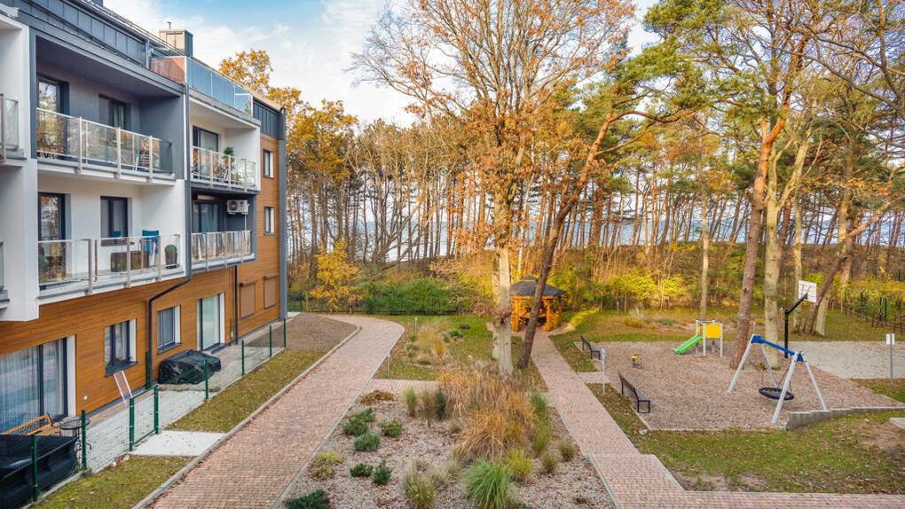 Die Apartments fügen sich harmonisch in die Küstenumgebung ein. Eine große Grünfläche rund um die Anlage, Ruheplätze und ein großzügiger Kinderspielplatz schaffen eine einzigartige Atmosphäre und bilden eine Oase für Kinder. Auch aktive Menschen und Senioren finden hier einen ruhigen Rückzugsort und einen gemütlichen Ort zum Ausruhen.