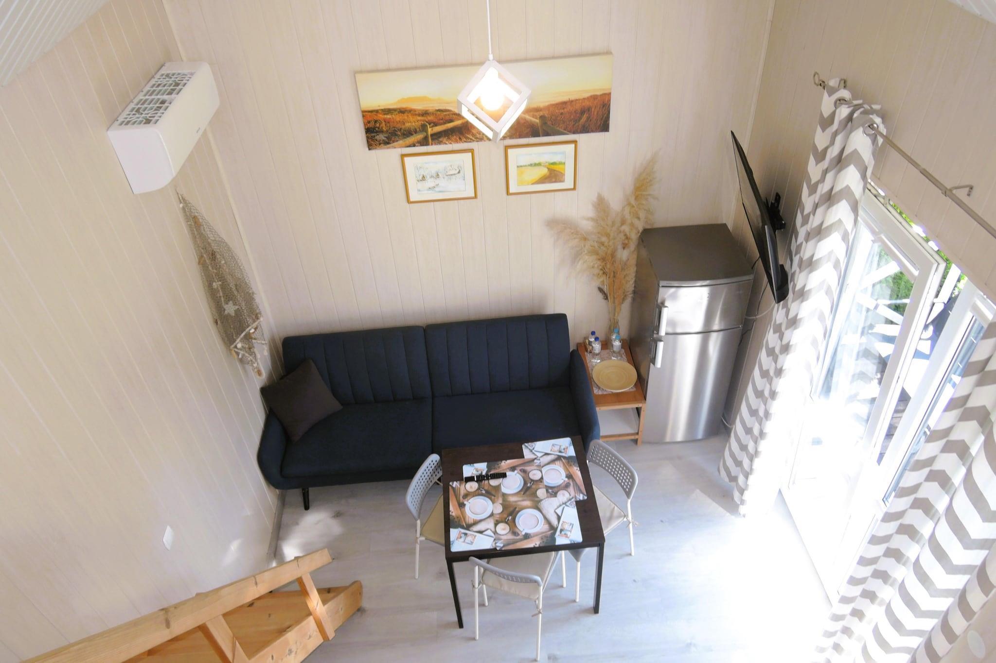 Parterre: (offene Küche(Wasserkocher, Kochendwasserhahn, Kochherd, Kühl-/Gefrierkombination), Wohn/Esszimmer(TV, Esstisch, Sitzecke), Schlafzimmer(Einzelbett), Schlafzimmer(Doppelbett), Badezimmer(Dusche, Waschbecken, Toilette)) In der 1. Etage: (Galerieschlafzimmer(Einzelbett, Einzelbett)) Verkauf eigener Produkte , Eier, Grill, Terrasse, Garten(Gemeinschaftliche Nutzung mit anderen Gästen, umzäunt, angelegt, 400 m2), Gartenmöbel, Liegen, Hängematte, Hochstuhl