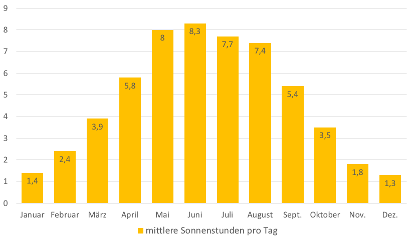 Die Sonne meint es gut mit Binz. So kann man sich nicht nur in den Sommermonaten über durchschnittlich knapp 8 Stunden Sonne freuen. Bereits im April scheint die Sonne im Durchschnitt knapp 6 Stunden am Tag um im Mai und Juni sogar bis zu 8 Stunden zu scheinen. Auch ein goldener Herbst ist bei knapp 4 Stunden täglich nicht ganz ausgeschlossen.