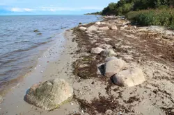 "Ruhiger, naturbelassener Sandstrand mit angrenzender Steilküste und einem Wald für Naturfans, zum sonnen, baden und wandern."