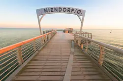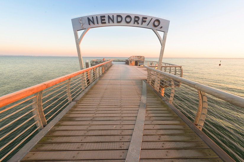 Die Seebrücke von Niendorf bietet einen tollen Blick aufs Meer und ist ein beliebter Ort zum Flanieren, Angeln oder Fotografieren – besonders bei Sonnenuntergang.
